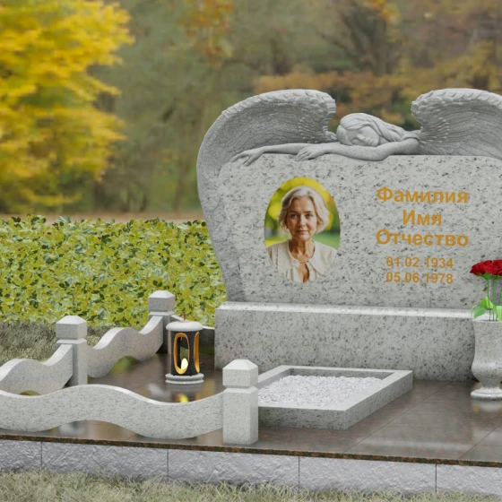 Представленный мемориальный комплекс (Артикул 130) является подлинным шедевром современной ритуальной архитектуры. Это не просто знак памяти, а монументальное художественное произведение, в котором гармонично сплелись суровая прочность природного камня и хрупкая нежность скульптурной пластики. Центральное место в композиции занимает величественная стела, выполненная в уникальном комбинированном стиле. Глубокий, антрацитово-черный массив основной плиты с безупречной зеркальной полировкой служит идеальным холстом для мемориальной гравировки. Его обрамляет искусно вырезанная из светлого камня фигура скорбящего ангела. Мастер добился поразительной детализации: вы можете видеть каждое перышко на мощных, распростертых крыльях, которые словно защищают покой ушедшего человека. Контраст между матовой, фактурной поверхностью резных элементов и глянцевым блеском основного камня создает невероятную визуальную глубину.