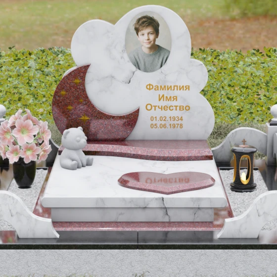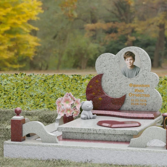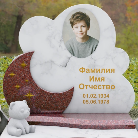 Данная мемориальная композиция — это воплощение нежности, глубокой любви и тихой грусти, застывшей в благородном камне. Выбор такой формы продиктован желанием выразить самые светлые чувства к ушедшему близкому человеку. Силуэт стелы, выполненный в виде мягкого, кучевого облака с плавными, округлыми очертаниями, символизирует покой и вечную жизнь души в небесных сферах. Асимметричная геометрия придает монументу индивидуальность, выделяя его среди строгих прямоугольных форм, и создает ощущение легкости, несмотря на внушительный вес натурального гранита. Особый акцент сделан на игре фактур и цветов: основная часть монумента из темного камня гармонично сочетается со вставкой из светлого гранита в форме изящного полумесяца. На этом светлом фоне выгравированы лаконичные золотые звезды, которые словно освещают путь памяти через десятилетия.