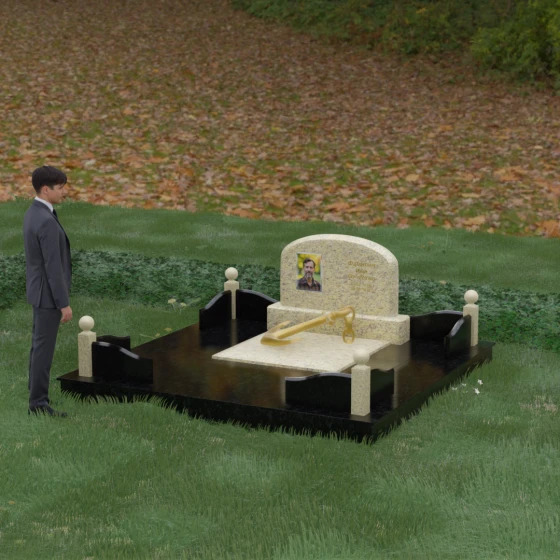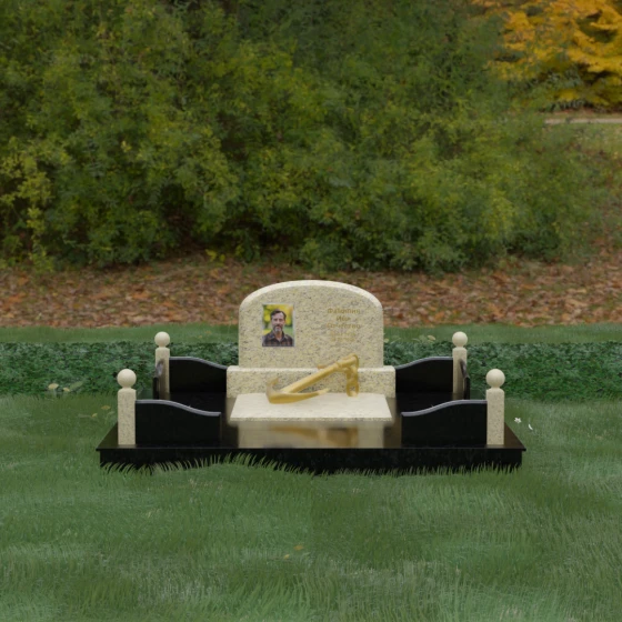 • Центральный символ: На надгробной плите расположен объемный декоративный элемент в виде золотого якоря с массивной цепью. Этот символ олицетворяет надежду, твердость характера и профессиональный путь, связанный со стихией, становясь смысловым центром всего мемориала.