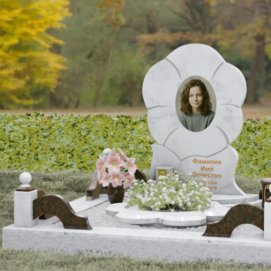 Каждая деталь этого проекта наполнена глубоким смыслом. Цветок в мемориальной пластике традиционно символизирует чистоту души, её расцвет и вечную весну в ином мире. Плавные, текучие линии боковых граней олицетворяют покой и отсутствие земных тревог. Декоративные резные блоки у основания напоминают о начале жизненного пути, о безмятежности и искренности, что делает эту модель особенно подходящей для увековечивания молодых и светлых личностей. Этот ансамбль создает ощущение защиты и умиротворения, превращая место захоронения в пространство светлой печали.