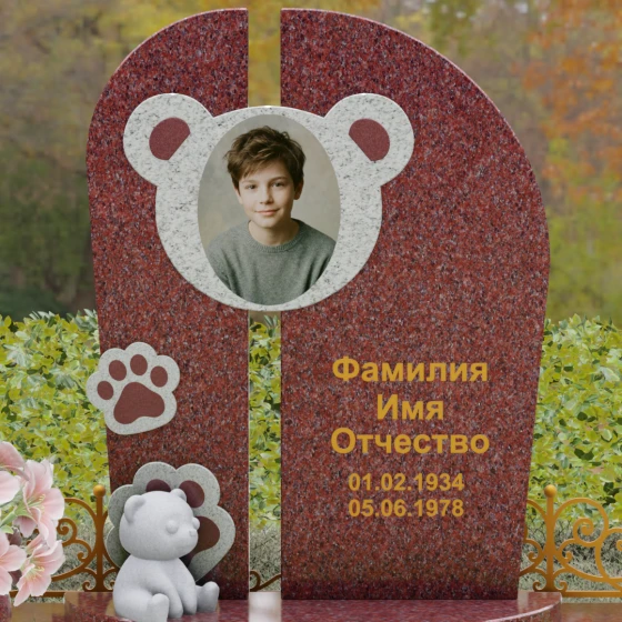 Композиция данного мемориала поражает своей уникальной архитектурой. Центральное вертикальное полотно разделено на две симметричные части узким вертикальным просветом, что создает ощущение легкости и устремленности ввысь, несмотря на внушительный вес камня. Главным художественным акцентом является медальон в верхней части, выполненный в виде стилизованной головы медвежонка. Портрет обрамлен светлой вставкой из благородного гранита, которая выступает над основной плоскостью, создавая эффект мягкого свечения вокруг лика.