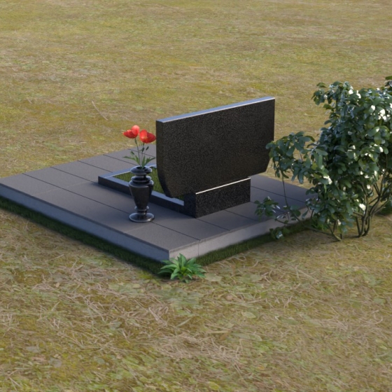 Горизонтальная плита, расположенная перед стелой, служит дополнительным элементом композиции, объединяя все части в единое целое. Ее полированная поверхность также отражает свет, создавая ощущение простора и легкости. Тумба, выполненная из того же материала, что и стела, обеспечивает устойчивость всей конструкции. Основание памятника выполнено из серых плит, что создает контраст с черным цветом стелы и плиты, подчеркивая их элегантность.