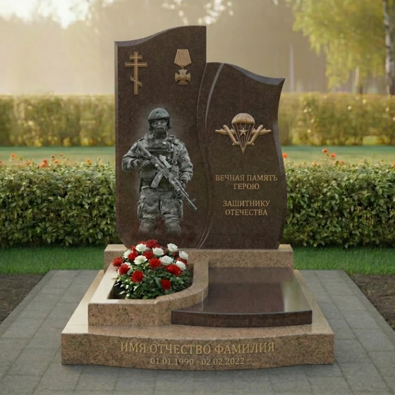 Правая стела, немного ниже и уже левой, имеет более динамичную, волнообразную форму. Ее верхняя часть плавно изгибается, создавая ощущение движения и легкости, несмотря на массивность камня. Лицевая сторона этой стелы также тщательно отполирована. В верхней части выгравирован символ Воздушно-десантных войск — парашют с крыльями, выполненный в золотистом цвете, что придает ему особую выразительность и значимость. Под ним располагаются проникновенные слова: "ВЕЧНАЯ ПАМЯТЬ ГЕРОЮ ЗАЩИТНИКУ ОТЕЧЕСТВА", выгравированные четким шрифтом, которые служат данью уважения и признательности. Боковые грани обеих стел имеют нежную, полуполированную обработку, которая мягко переходит в идеально отполированную лицевую часть, подчеркивая природную красоту камня и мастерство его обработки.