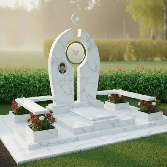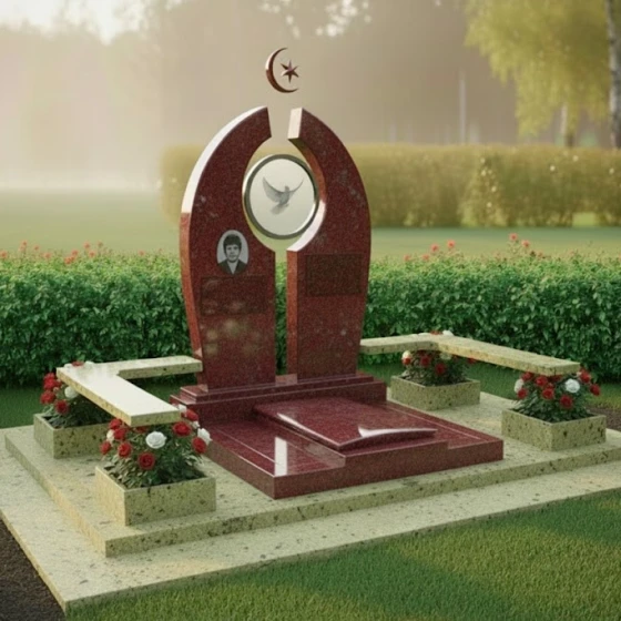 В основе композиции лежит впечатляющая стела, выполненная в уникальной архитектурной форме, напоминающей раскрытые врата или арку, символизирующую переход и вечность. Ее грани обработаны с особой тщательностью, создавая игру света и тени: идеально отполированные до зеркального блеска фронтальные и боковые поверхности контрастируют с тонкими матовыми срезами, подчеркивающими объем и глубину камня. Центральный элемент стелы — изящная полукруглая арка, увенчанная полумесяцем и звездой, выполненными в объемной резьбе, что придает изделию выразительность и духовное значение.