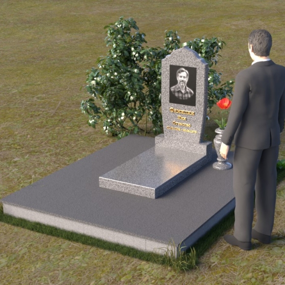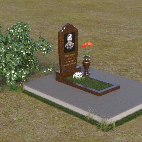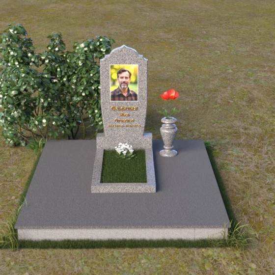 Надгробие из натурального камня ПВ 061 представляет собой элегантную композицию, сочетающую в себе строгость линий и плавные изгибы. Основная стела имеет форму, напоминающую стилизованную арку, с мягкими, скругленными плечами. Верхняя часть стелы украшена деликатными выемками, создающими эффект благородной старины. Боковые грани стелы тщательно отполированы, что придает памятнику законченный и респектабельный вид. Нижняя часть стелы переходит в прямоугольное основание, на которое устанавливается горизонтальная плита. Эта плита, выполненная в зеркальной полировке, отражает небо и окружающий ландшафт, создавая ощущение легкости и воздушности. Фаски на плитах аккуратно сняты, подчеркивая геометрию форм. Сбоку от основной стелы располагается небольшая ваза, выполненная в том же стиле и из того же материала, что и памятник. Ее изящная форма добавляет композиции завершенность и позволяет разместить живые цветы, символизирующие вечную память.