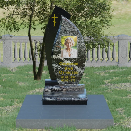 Основой художественного замысла выступает эффектная асимметрия и игра контрастных фактур. Центральная часть надгробия, предназначенная для размещения портрета и памятных надписей, выполнена в форме изящного лепестка или капли из глубокого черного камня. Ее плавные, текучие линии символизируют бесконечность бытия и чистоту души. Оправа, охватывающая центральный элемент с левой стороны, имеет более строгую, динамичную геометрию с выраженным острым углом в верхней части, что создает визуальный эффект защищенности и опоры. Особое внимание уделено деталям: на левом «крыле» композиции лаконично расположился восьмиконечный православный крест, выполненный в технике глубокой гравировки с последующим золочением. Это придает всей конструкции духовную завершенность и благородство.