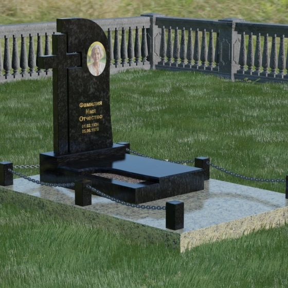 Правая часть стелы — это широкое каменное полотно с мягким, плавным изгибом в верхней части, напоминающим небесный свод или церковный купол. Контраст между прямолинейностью креста и текучестью основной плиты создает уникальный художественный ритм. Боковые грани и верхушка изделия отполированы до зеркального блеска, в котором отражается небо, в то время как глубокая гравировка текста и портрета в овальной нише подчеркивают индивидуальность монумента. Особую массивность конструкции придает основание — монумент возведен на высокий гранитный цоколь. По периметру установлены монументальные столбики с декоративными фасками, соединенные массивными цепями, что создает защищенный контур и атмосферу уединенного покоя.
