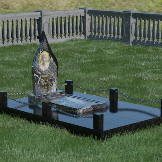 Особое внимание уделено благоустройству прилегающей территории. Мемориальная композиция включает в себя полное мощение участка массивными плитами из натурального камня. Это не только придает захоронению законченный и величественный вид, но и является практичным решением, избавляющим от необходимости постоянной борьбы с сорняками или проседания грунта. Периметр участка обозначен аккуратными каменными столбиками, соединенными декоративными цепями. Такая ограда создает визуальную и сакральную границу, защищая покой усопшего и подчеркивая обособленность места памяти. Каждый элемент — от полированных фасок на цоколе до золотистой гравировки имен — выполнен с ювелирной точностью.