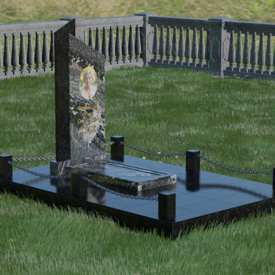 Особое внимание уделено благоустройству прилегающей территории. Мемориал установлен на прочное основание, а всё пространство участка закрыто сплошной надгробной плитой из натурального камня. Такое решение не только придает комплексу монолитный и законченный вид, но и значительно упрощает уход за местом захоронения, исключая прорастание сорной травы. Периметр участка обозначен изысканным ограждением: массивные гранитные столбики соединены декоративными цепями, что создает атмосферу защищенности и уединения, отделяя мемориальное пространство от внешнего мира.