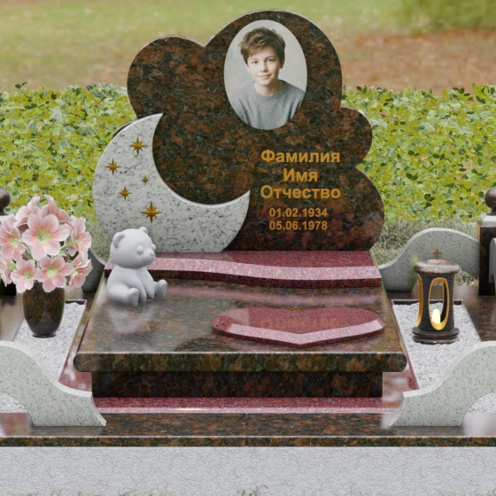 Данная мемориальная композиция — это воплощение нежности, глубокой любви и тихой грусти, застывшей в благородном камне. Выбор такой формы продиктован желанием выразить самые светлые чувства к ушедшему близкому человеку. Силуэт стелы, выполненный в виде мягкого, кучевого облака с плавными, округлыми очертаниями, символизирует покой и вечную жизнь души в небесных сферах. Асимметричная геометрия придает монументу индивидуальность, выделяя его среди строгих прямоугольных форм, и создает ощущение легкости, несмотря на внушительный вес натурального гранита. Особый акцент сделан на игре фактур и цветов: основная часть монумента из темного камня гармонично сочетается со вставкой из светлого гранита в форме изящного полумесяца. На этом светлом фоне выгравированы лаконичные золотые звезды, которые словно освещают путь памяти через десятилетия.