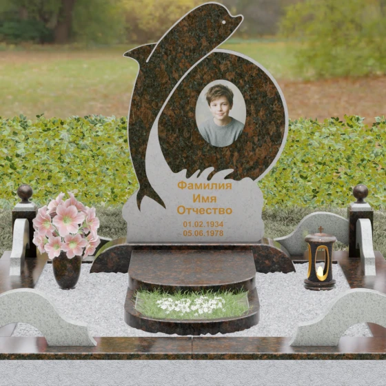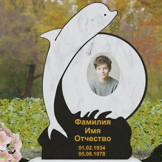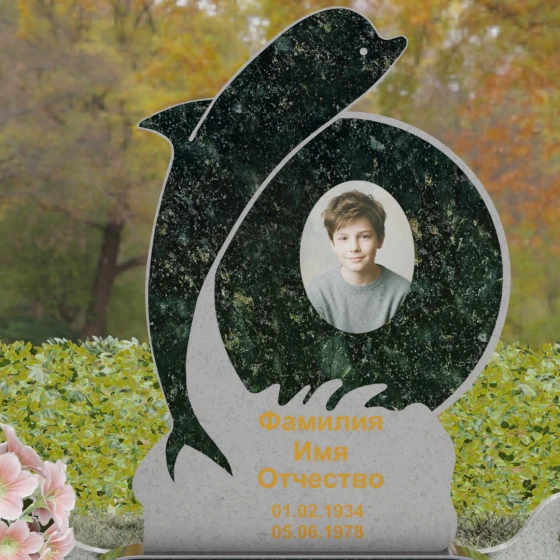 Этот гранитный монумент представляет собой не просто мемориальный знак, а настоящую художественную композицию, преисполненную глубокого символизма. Центральное место в дизайне занимает фигура дельфина — древнего символа спасения, чистоты и проводника душ в лучший мир. Плавный, динамичный изгиб морского обитателя словно обнимает центральный медальон, создавая защищенное, камерное пространство для портрета близкого человека. Мастера добились удивительной игры контрастов: зеркально отполированное туловище дельфина эффектно выделяется на фоне матовой, детально проработанной резьбы в основании, имитирующей морскую пену и гребни волн.