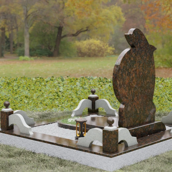 Конструкция памятника продумана до мелочей и включает в себя полное благоустройство участка. Основание мемориала установлено на прочный каменный цоколь, обеспечивающий идеальную геометрию и устойчивость всей композиции. Периметр участка обрамлен низким бордюром из полированного камня, который визуально выделяет сакральное пространство. Вместо традиционного открытого грунта используется сплошная надгробная плита — это не только придает комплексу завершенный и аккуратный вид в европейском стиле, но и значительно упрощает поддержание чистоты.