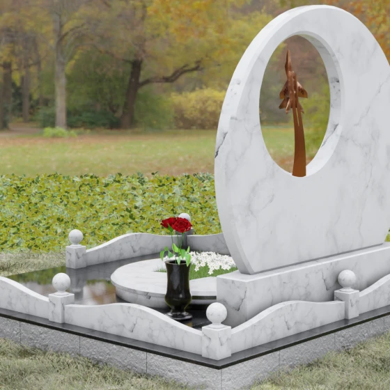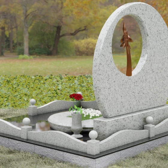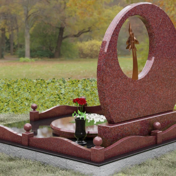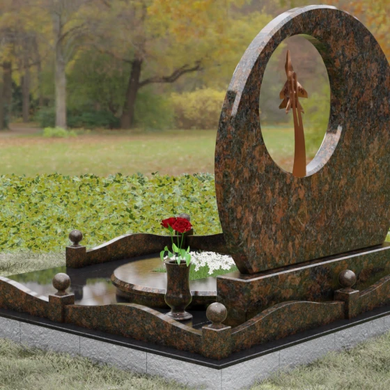 Выбор мемориальной композиции — это всегда поиск баланса между земной скорбью и небесным триумфом человеческого духа. Данная величественная стела, выполненная в уникальной геометрии круга с асимметричным сквозным вырезом, представляет собой не просто памятный знак, а глубокое философское высказывание. Символизм окружности отсылает нас к идее бесконечности, небесного свода и завершенности жизненного пути. Внутреннее пространство стелы акцентировано филигранной металлической фигурой взмывающего ввысь истребителя. Этот элемент несет в себе мощный эмоциональный заряд: он олицетворяет прорыв сквозь земные преграды, вечный полет и верность призванию, которое сильнее самой смерти.