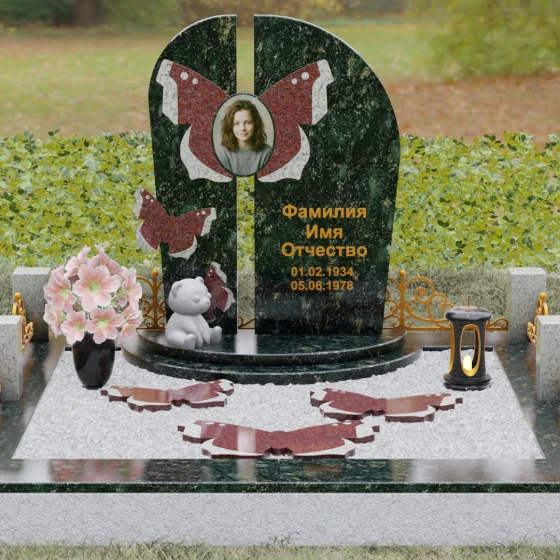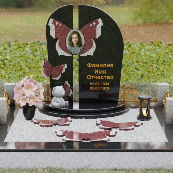 Центральным элементом ансамбля выступает величественная вертикальная стела, разделенная узким вертикальным просветом на две симметричные части. Этот архитектурный прием создает эффект воздушности и позволяет свету проникать сквозь плотную массу камня, символизируя открытость небесных врат и свободу духа. Верхушка стелы оформлена плавным полукруглым изгибом, лишенным острых углов, что дарит ощущение абсолютного умиротворения и вечного покоя. Главным художественным акцентом является мастерски выполненная инкрустация в виде расправленных крыльев бабочки, которые бережно обрамляют центральный овальный портрет. Контрастная игра фактур — зеркально-черного полированного гранита и насыщенных красных вставок с белым природным рисунком — создает поразительный визуальный объем. Изящная золоченая гравировка шрифта придает оформлению особую торжественность, отчетливо выделяясь на темном фоне камня и сохраняя читаемость на долгие десятилетия.
