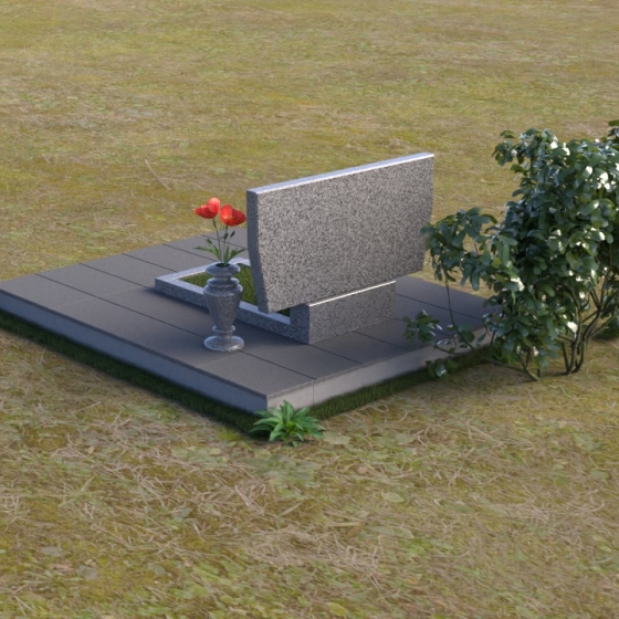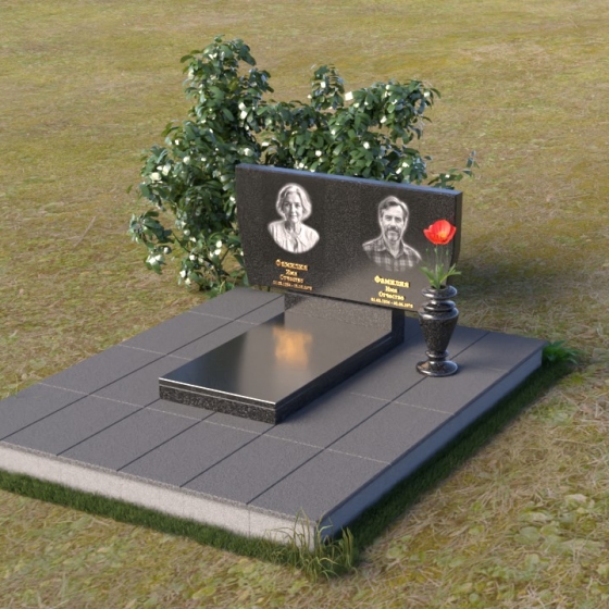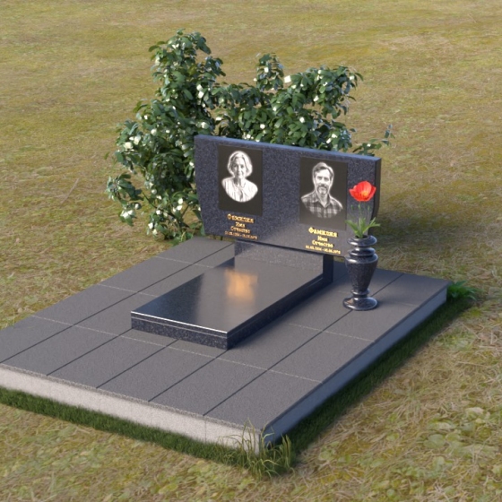 Это ритуальное изделие представляет собой гармоничное сочетание прямых линий и мягких, едва уловимых изгибов, создающих ощущение покоя и умиротворения. Стела имеет прямоугольную форму, но ее верхняя грань слегка скошена, что придает ей визуальную легкость и динамику. Обратите внимание на зеркальную полировку лицевой стороны – она отражает небо и окружающий мир, словно заключая в себе вечность. На полированной поверхности выгравированы портреты усопших и памятные надписи, выполненные с высокой точностью и детализацией. Слева от стелы, на основании, располагается небольшая горизонтальная плита с аналогичной полировкой, создающая дополнительное пространство для цветов или памятных предметов. Основание памятника выполнено из серого камня с матовой фактурой, что создает контраст с блестящей стелой и придает композиции устойчивость и завершенность. Рядом с плитой установлена ваза, выполненная из того же черного полированного гранита, что и стела, что обеспечивает единство стиля и служит достойным обрамлением для живых цветов, символизирующих вечную память.