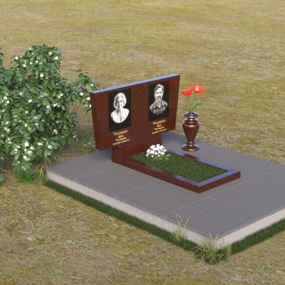 Этот памятник представляет собой изысканную композицию, где строгость линий сочетается с плавными, утонченными деталями. Стела имеет прямоугольную форму с асимметричной верхней гранью. С левой стороны верхний угол плавно скошен вниз, создавая ощущение ниспадающей драпировки или крыла ангела, оберегающего покой усопших. Правый верхний угол стелы остается прямым, что придает конструкции визуальную устойчивость и завершенность. Боковые грани стелы тщательно отполированы, что создает эффект зеркального блеска, отражающего окружающий мир и символизирующего связь между земным и небесным. Под стелой располагается горизонтальная плита меньшего размера, также выполненная в зеркальной полировке, создавая эффект единого целого и усиливая визуальную глубину композиции. Все элементы памятника установлены на широкое основание, облицованное плиткой серого цвета, что обеспечивает устойчивость и долговечность конструкции.