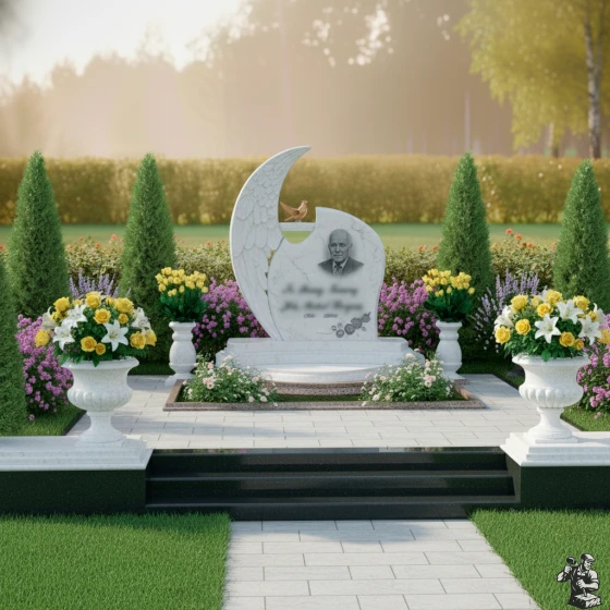 Дизайн этого гранитного монумента глубоко символичен. Форма, напоминающая ангельское крыло, олицетворяет покой, защиту и вечное упокоение души под сенью небесной благодати. Голубь, расположенный на вершине, традиционно ассоциируется с миром, надеждой и чистотой души, что делает эту композицию особенно проникновенной. Общая пластика форм, с ее плавными изгибами и мягкими линиями, создает ощущение умиротворения и безмятежности. Этот мемориал становится не просто обозначением места захоронения, а настоящим произведением искусства, выражающим глубокую любовь, уважение и стремление сохранить светлую память о человеке на долгие века.
