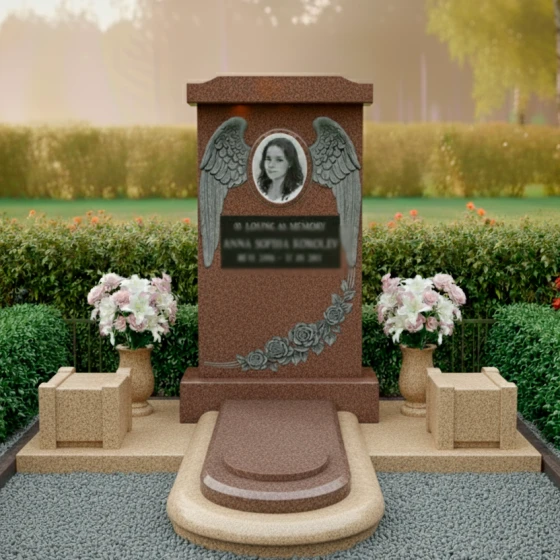 Оформление: Форма стелы ПН 135 с ее четкими линиями и плавными изгибами идеально подходит для различных видов гравировки. Овальный медальон для портрета, обрамленный крыльями ангела, создает идеальное пространство для размещения изображения усопшего, которое будет выглядеть гармонично и достойно. Пространство под портретом и цветами позволяет элегантно расположить гравировку с полным именем, датами жизни и эпитафией. Рекомендуется использовать классические шрифты, которые подчеркнут торжественность и значимость момента, а также рассмотреть возможность добавления золочения или серебрения букв для придания дополнительной выразительности и долговечности надписям. Глубокая гравировка на полированной поверхности гранита будет смотреться особенно эффектно, обеспечивая четкость и читаемость на долгие годы.