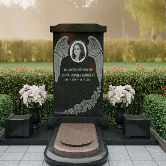Особое внимание привлекает художественное оформление стелы. В верхней части выгравированы изящные, детально проработанные крылья ангела, обрамляющие овальный медальон для портрета. Каждое перо этих крыльев выполнено с удивительной точностью, создавая ощущение легкости и воздушности, символизируя вознесение души и ее вечный покой. Ниже, в левой части стелы, расположена гравировка в виде пышного букета роз, спускающегося каскадом. Лепестки каждой розы прорисованы с невероятной тщательностью, передавая их объем и нежность. Матовая фактура резьбы на фоне глубокого черного полированного камня создает выразительный контраст, который придает изображению живость и реалистичность. Розы, как символ любви и скорби, здесь представлены в своем наивысшем расцвете, что говорит о вечной памяти и неувядающей привязанности.