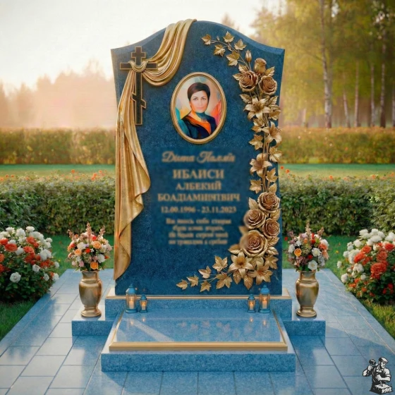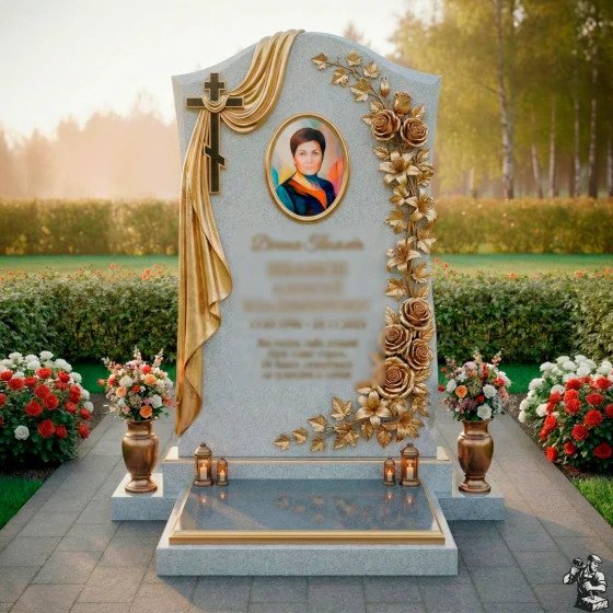 Центральное место на стеле занимает элегантный овальный медальон для портрета, обрамленный тонкими, но выразительными золотыми линиями, которые придают ему особую торжественность. Слева от портрета ниспадает объемная драпировка из камня, искусно имитирующая мягкие складки ткани, что символизирует покой и вечный сон. В верхней части драпировки расположен лаконичный православный крест, выполненный в строгом, но выразительном стиле, подчеркивающий духовное значение мемориала. Правая сторона стелы украшена пышной резной композицией из роз и вьющихся листьев, выполненных с невероятной детализацией. Каждая роза, каждый лепесток вырезан с филигранной точностью, создавая ощущение живого букета. Контраст между черной полированной поверхностью камня и светлыми, матовыми срезами резных элементов придает композиции объем и выразительность, подчеркивая красоту и хрупкость цветов. Эта модель доступна в 8 различных цветовых решениях, что позволяет подобрать камень, который наилучшим образом отразит индивидуальность и характер усопшего. Среди них: глубокий и насыщенный гранит амфиболит, благородный Балтик грин, уникальный Блю Перл, классический Габбро-диабаз, теплый Дымовский, величественный Лезниковский, светлый Мансуровский и изысканный мрамор Тассо. Каждый из этих материалов обладает своей неповторимой фактурой и оттенком, что позволяет создать по-настоящему уникальный и персонализированный мемориал, достойный светлой памяти. Выбор камня становится важным шагом в создании образа, который будет гармонировать с воспоминаниями о человеке, сохраняя его уникальность на века.