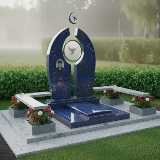 В основе композиции лежит впечатляющая стела, выполненная в уникальной архитектурной форме, напоминающей раскрытые врата или арку, символизирующую переход и вечность. Ее грани обработаны с особой тщательностью, создавая игру света и тени: идеально отполированные до зеркального блеска фронтальные и боковые поверхности контрастируют с тонкими матовыми срезами, подчеркивающими объем и глубину камня. Центральный элемент стелы — изящная полукруглая арка, увенчанная полумесяцем и звездой, выполненными в объемной резьбе, что придает изделию выразительность и духовное значение.
