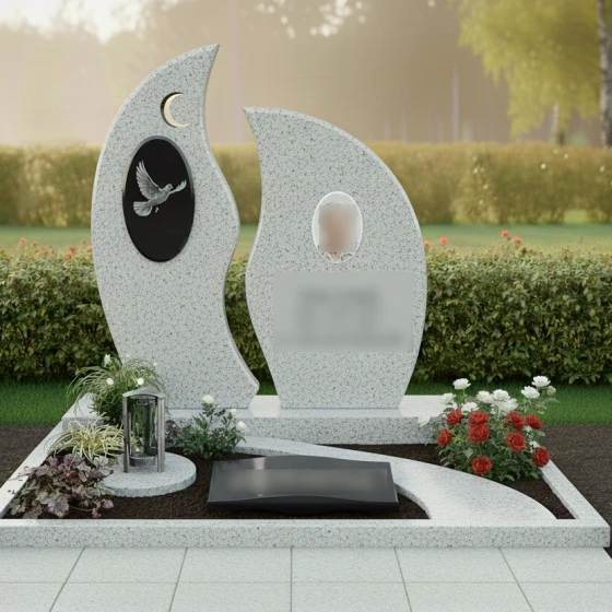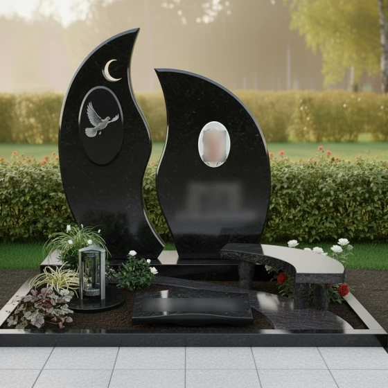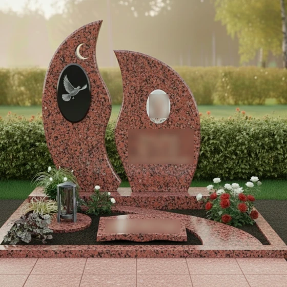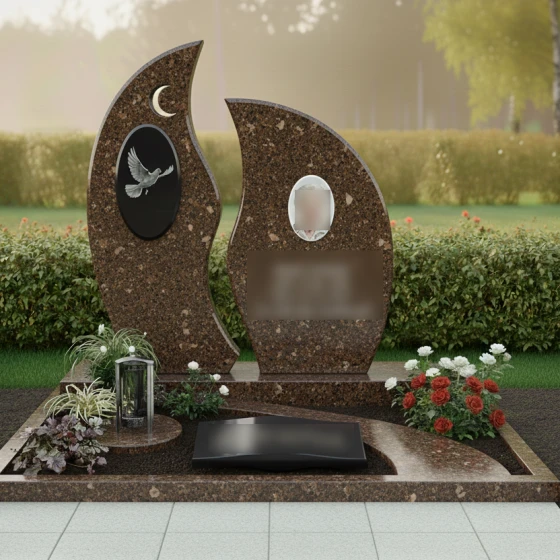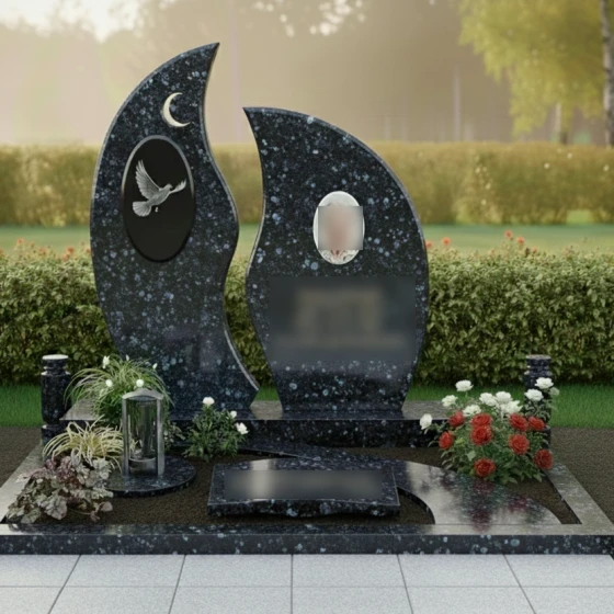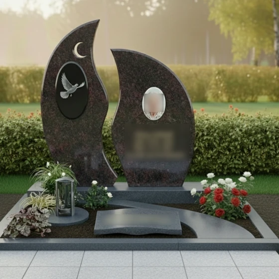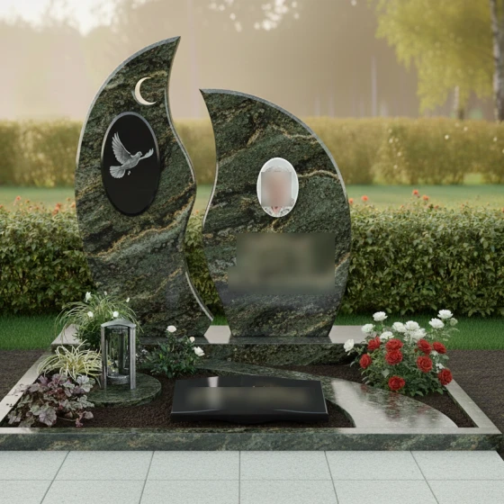 Центральным элементом композиции является величественная стела, состоящая из двух асимметричных вертикальных элементов. Их контуры напоминают языки священного пламени или лепестки экзотического цветка, стремящиеся ввысь. Левая часть монумента украшена изящным рельефом полумесяца и глубоким овальным медальоном, внутри которого запечатлен парящий голубь. Проработка оперения птицы и плавность ее полета на фоне темного камня подчеркивают хрупкость жизни и торжество духа. Правая часть композиции предназначена для размещения портрета и памятных надписей, уравновешивая общую визуальную массу.