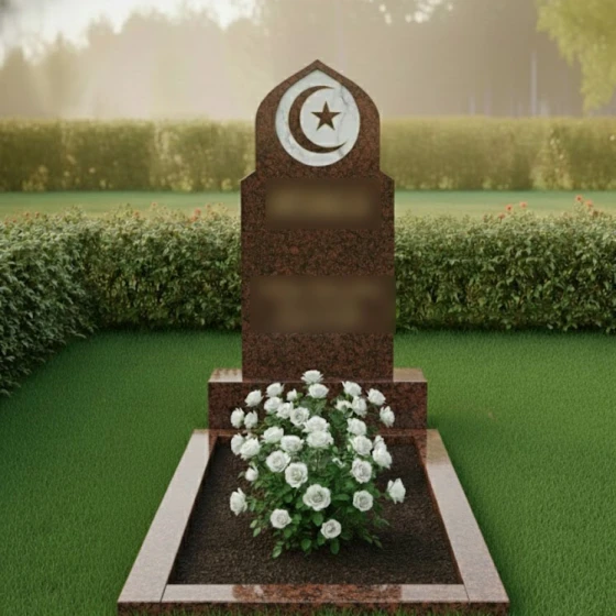 Данный мемориальный ансамбль представляет собой истинное воплощение благородства и духовной глубины. Величественная стела, выполненная в форме традиционного восточного купола или стрельчатой арки, сразу приковывает взгляд своей безупречной геометрией. Главным художественным акцентом композиции является искусно интегрированный медальон из белоснежного мрамора, расположенный в верхней части обелиска. В центре этого светлого круга филигранно вырезаны символы веры — полумесяц и пятиконечная звезда. Контраст между глубоким темным цветом основного камня и матовой чистотой мраморной вставки создает эффект небесного свечения, подчеркивая торжественность и значимость момента памяти. Плавные, но при этом строгие линии резьбы по контуру стелы свидетельствуют о высочайшем уровне камнерезного мастерства, превращая холодный камень в одухотворенное изваяние.