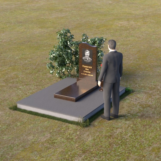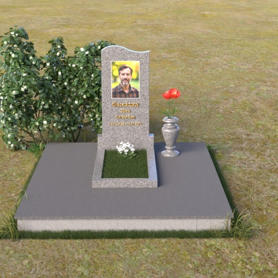 Представленная мемориальная композиция отличается лаконичностью и элегантностью. Ее строгие формы, смягченные плавными изгибами, символизируют как жизненный путь, так и обретение покоя. Верхняя часть стелы имеет мягкий, едва заметный изгиб, словно склоняясь в знак уважения. Грани стелы деликатно обработаны, что придает ей завершенный и благородный вид. На лицевой стороне выгравированы портрет усопшего и памятные надписи, выполненные с особой тщательностью.