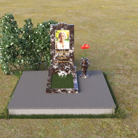 Величественная стела памятника ПВ 008 представляет собой элегантное сочетание строгих линий и плавных изгибов. Верхняя часть стелы имеет волнообразную форму, смягчающую строгость камня и придающую ей утонченность. Грани стелы тщательно отполированы до зеркального блеска, отражая свет и создавая ощущение легкости и воздушности. На лицевой стороне стелы размещен портрет усопшего, выполненный методом гравировки. Ниже располагаются надпись с именем и датами жизни. Под стелой расположена горизонтальная плита, также выполненная из полированного гранита. Ее строгие прямоугольные формы контрастируют с плавными линиями стелы, подчеркивая ее выразительность. Фаски по периметру плиты смягчают углы и придают ей завершенный вид. Рядом со стелой установлена небольшая ваза из темного гранита с изящным орнаментом, предназначенная для живых цветов.