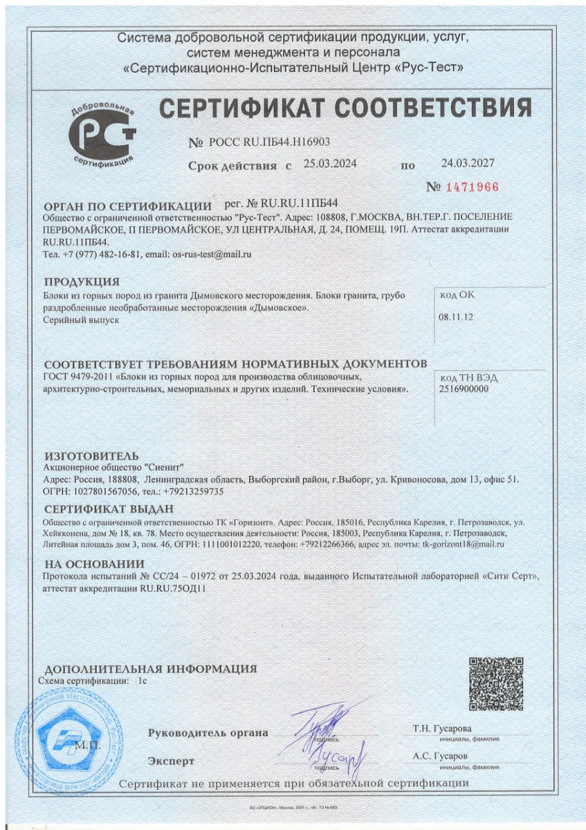 Мы хотим, чтобы вы были абсолютно уверены в качестве и безопасности материала, из которого будет изготовлен памятник для ваших близких. Поэтому мы публикуем сертификаты соответствия на основные виды гранита, которые мы используем в работе.