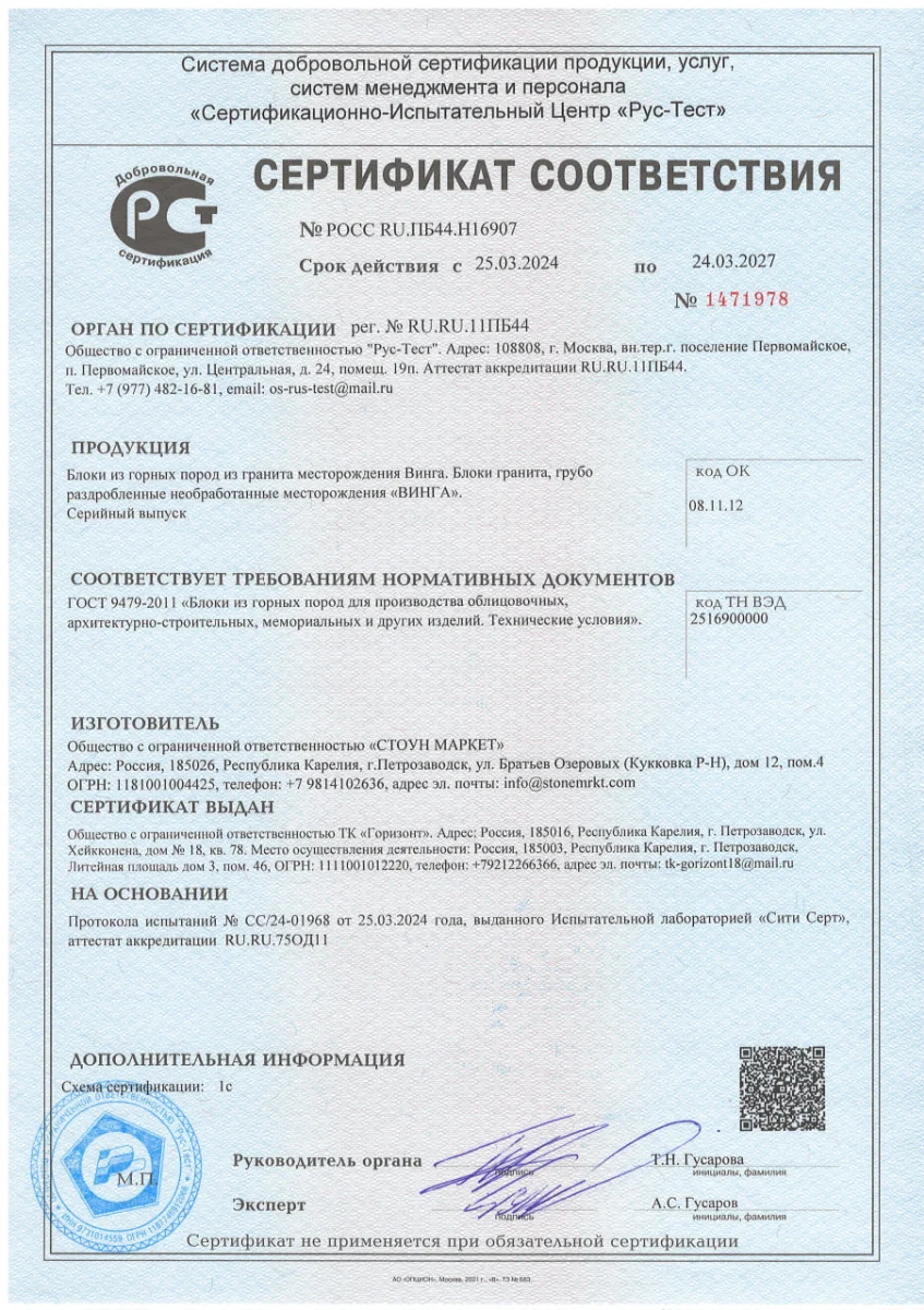 Сертификаты: Гарантия качества и безопасности камня «Мастер Каменев»
